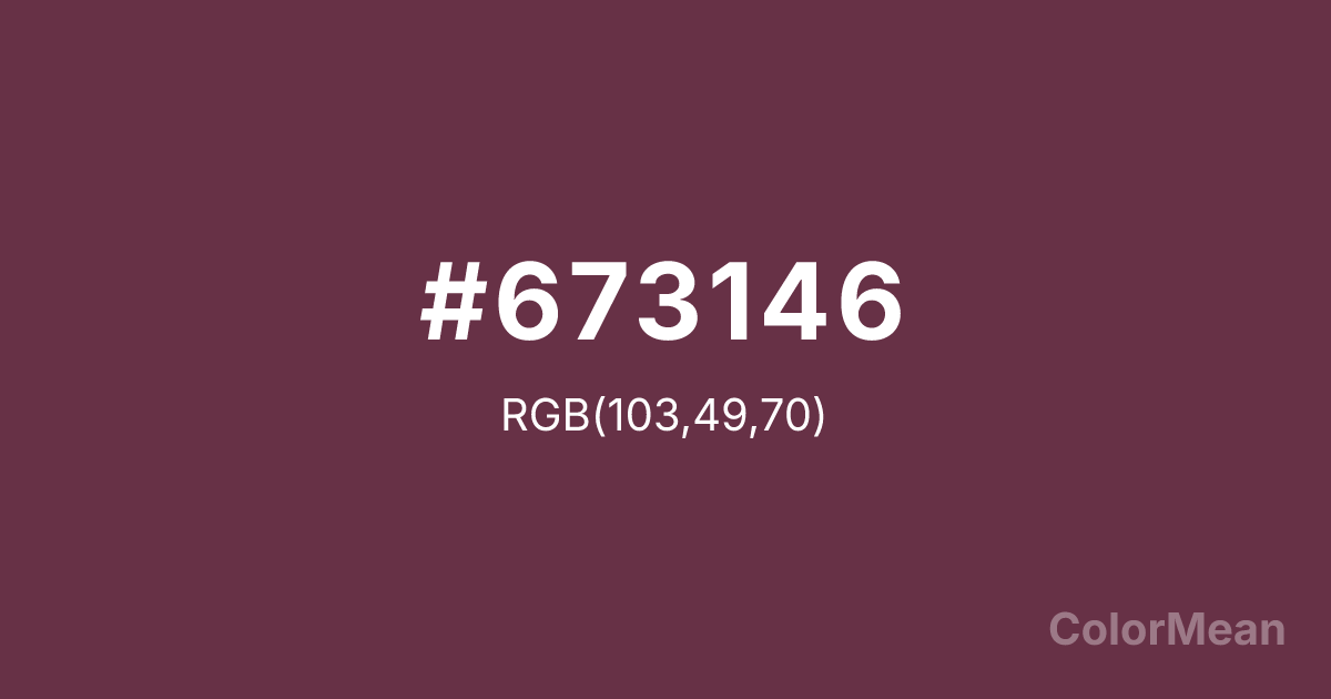 #673146 RGB value is (103, 49, 70). The hex color red value is 103, green is 49, and blue is 70. Its HSL format shows a hue of 337°, saturation of 36 percent, and lightness of 30 percent. The CMYK process values are 0 percent, 52 percent, 32 percent, 60 percent.