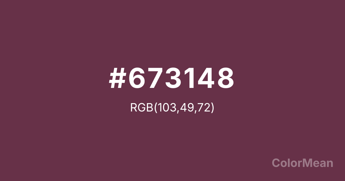 #673148 RGB value is (103, 49, 72). The hex color red value is 103, green is 49, and blue is 72. Its HSL format shows a hue of 334°, saturation of 36 percent, and lightness of 30 percent. The CMYK process values are 0 percent, 52 percent, 30 percent, 60 percent.