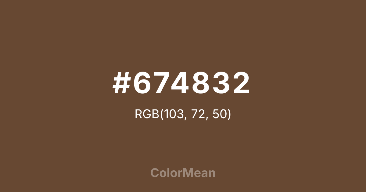 #674832 RGB value is (103, 72, 50). The hex color red value is 103, green is 72, and blue is 50. Its HSL format shows a hue of 25°, saturation of 35 percent, and lightness of 30 percent. The CMYK process values are 0 percent, 30 percent, 51 percent, 60 percent.