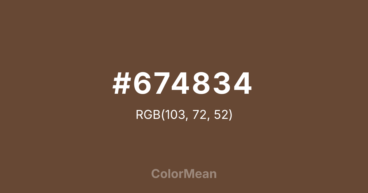 #674834 RGB value is (103, 72, 52). The hex color red value is 103, green is 72, and blue is 52. Its HSL format shows a hue of 24°, saturation of 33 percent, and lightness of 30 percent. The CMYK process values are 0 percent, 30 percent, 50 percent, 60 percent.