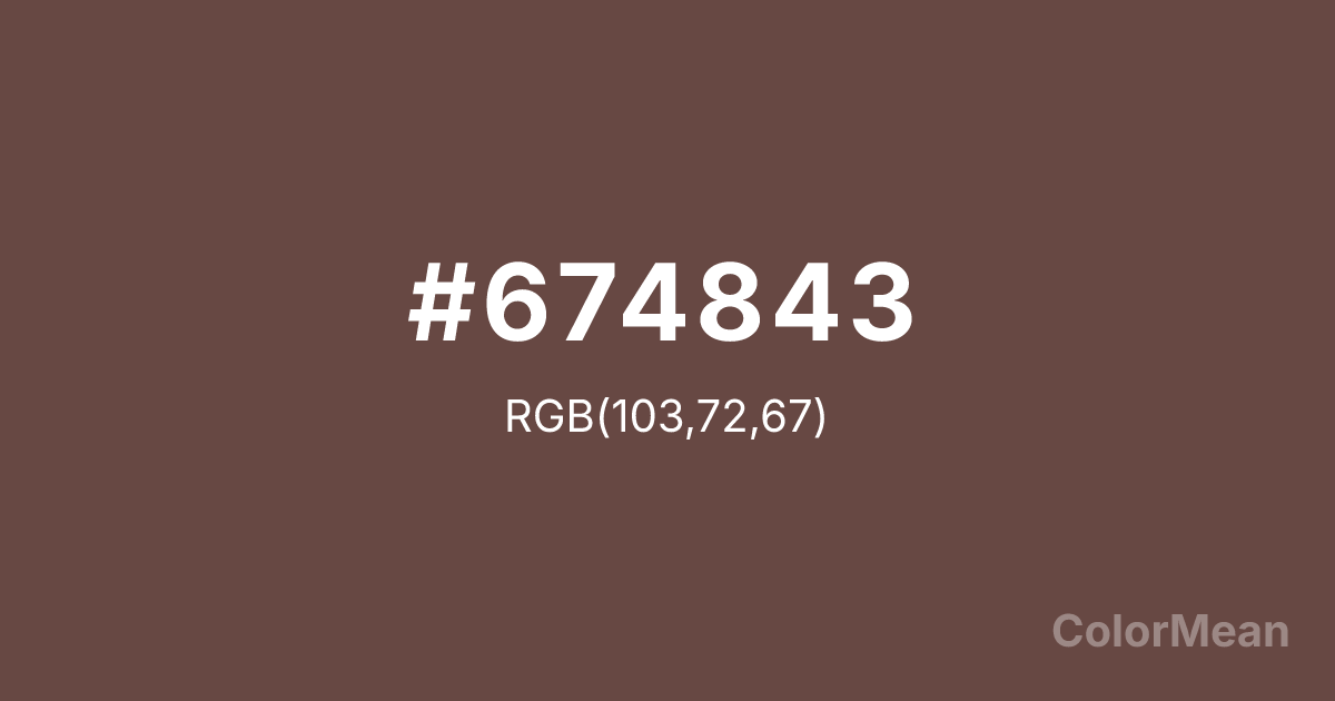 #674843 RGB value is (103, 72, 67). The hex color red value is 103, green is 72, and blue is 67. Its HSL format shows a hue of 8°, saturation of 21 percent, and lightness of 33 percent. The CMYK process values are 0 percent, 30 percent, 35 percent, 60 percent.