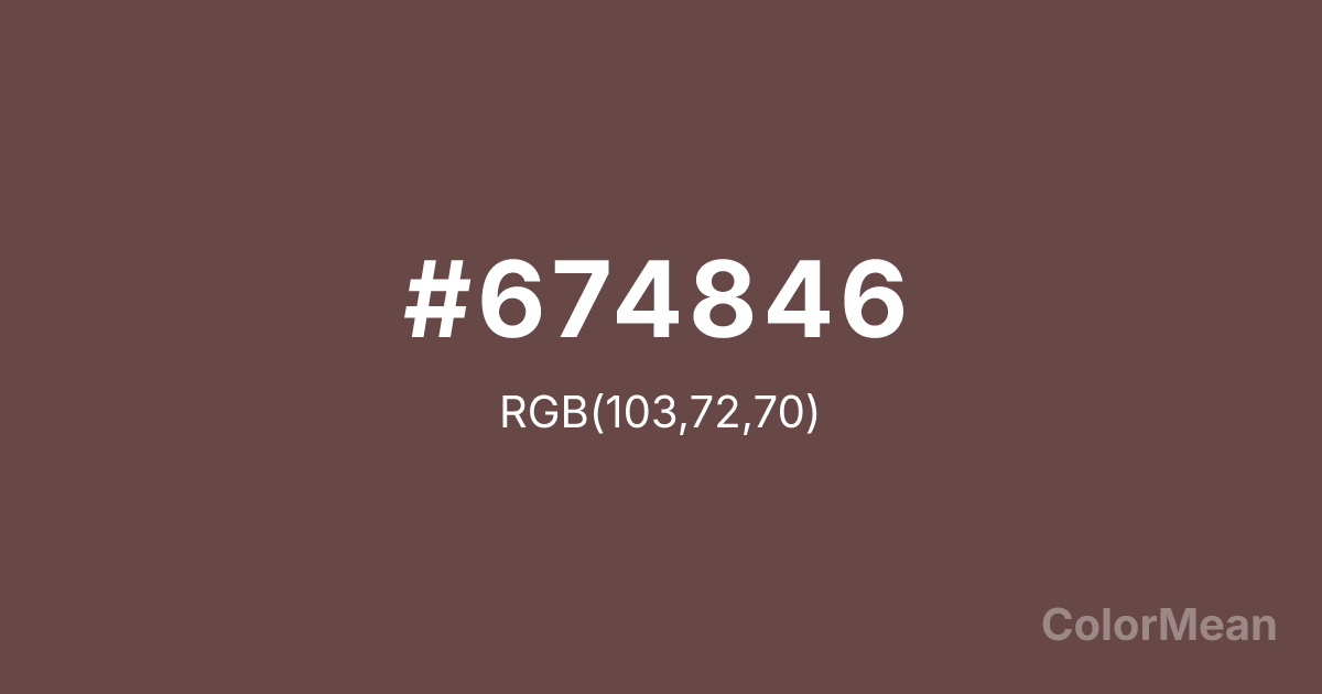 Rose Ebony (#674846) RGB value is (103, 72, 70). The hex color red value is 103, green is 72, and blue is 70. Its HSL format shows a hue of 4°, saturation of 19 percent, and lightness of 34 percent. The CMYK process values are 0 percent, 30 percent, 32 percent, 60 percent.