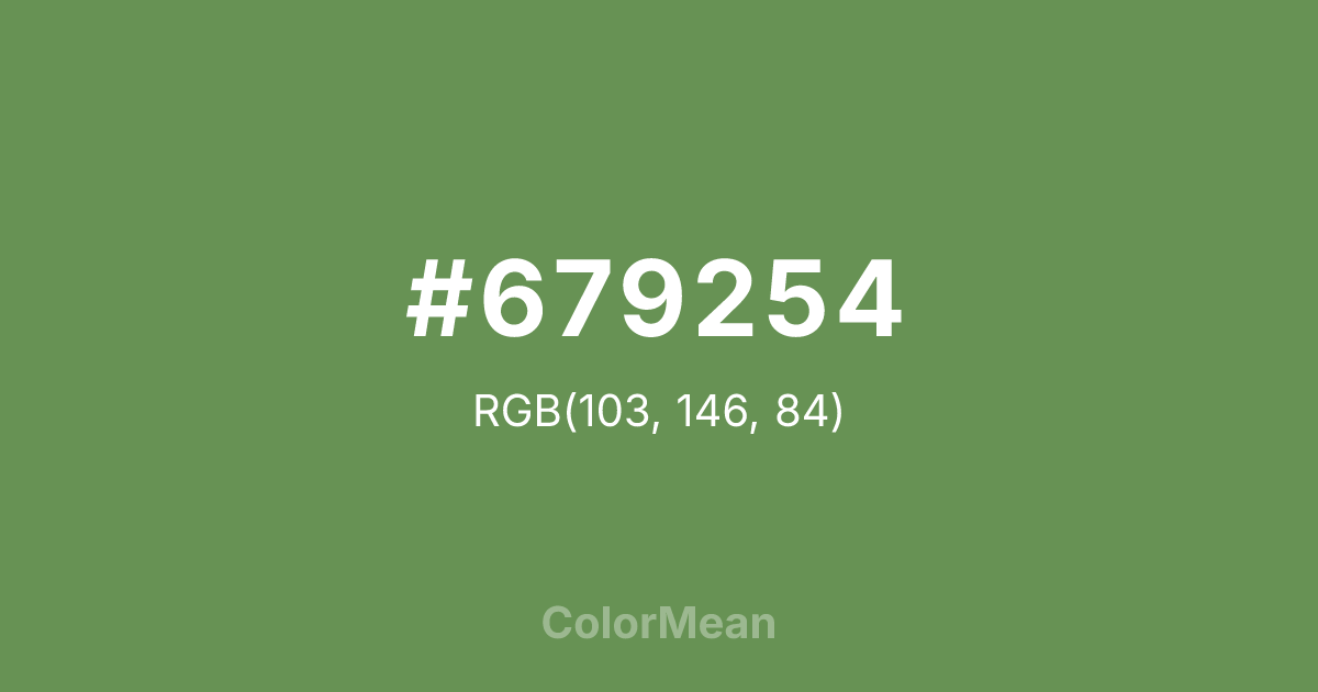 #679254 RGB value is (103, 146, 84). The hex color red value is 103, green is 146, and blue is 84. Its HSL format shows a hue of 102°, saturation of 27 percent, and lightness of 45 percent. The CMYK process values are 29 percent, 0 percent, 42 percent, 43 percent.