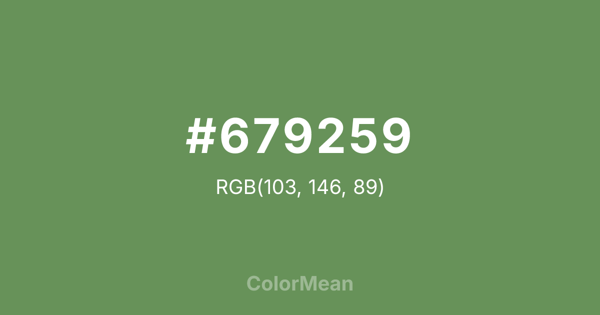 #679259 RGB value is (103, 146, 89). The hex color red value is 103, green is 146, and blue is 89. Its HSL format shows a hue of 105°, saturation of 24 percent, and lightness of 46 percent. The CMYK process values are 29 percent, 0 percent, 39 percent, 43 percent.