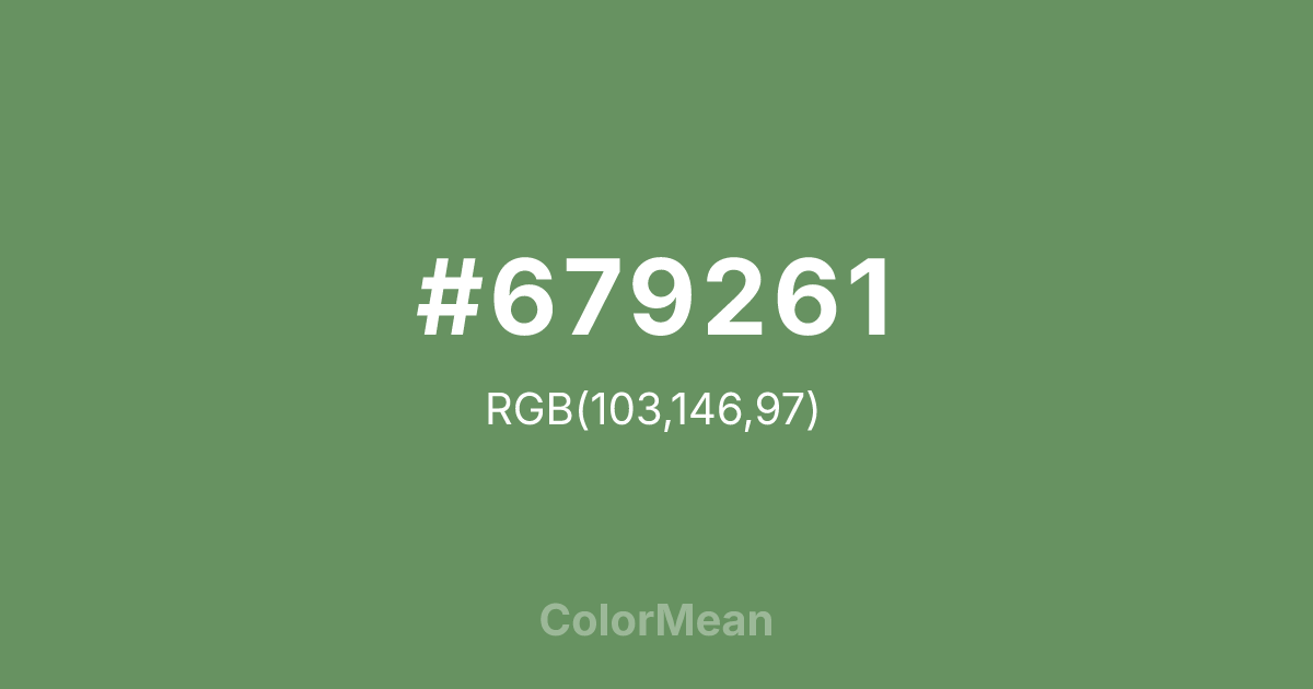 #679261 RGB value is (103, 146, 97). The hex color red value is 103, green is 146, and blue is 97. Its HSL format shows a hue of 113°, saturation of 20 percent, and lightness of 48 percent. The CMYK process values are 29 percent, 0 percent, 34 percent, 43 percent.