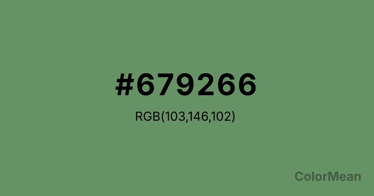 #679266 RGB value is (103, 146, 102). The hex color red value is 103, green is 146, and blue is 102. Its HSL format shows a hue of 119°, saturation of 18 percent, and lightness of 49 percent. The CMYK process values are 29 percent, 0 percent, 30 percent, 43 percent.