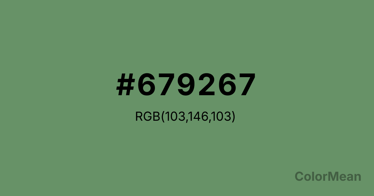 Russian Green (#679267) RGB value is (103, 146, 103). The hex color red value is 103, green is 146, and blue is 103. Its HSL format shows a hue of 120°, saturation of 17 percent, and lightness of 49 percent. The CMYK process values are 29 percent, 0 percent, 29 percent, 43 percent.