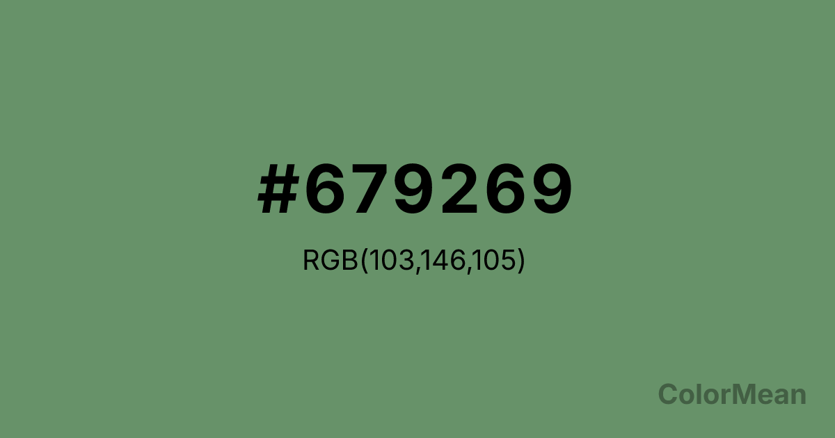 #679269 RGB value is (103, 146, 105). The hex color red value is 103, green is 146, and blue is 105. Its HSL format shows a hue of 123°, saturation of 17 percent, and lightness of 49 percent. The CMYK process values are 29 percent, 0 percent, 28 percent, 43 percent.