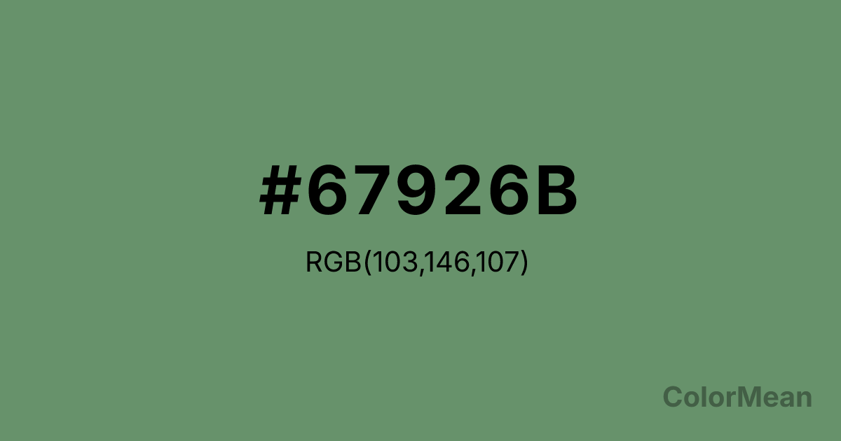 #67926B RGB value is (103, 146, 107). The hex color red value is 103, green is 146, and blue is 107. Its HSL format shows a hue of 126°, saturation of 17 percent, and lightness of 49 percent. The CMYK process values are 29 percent, 0 percent, 27 percent, 43 percent.