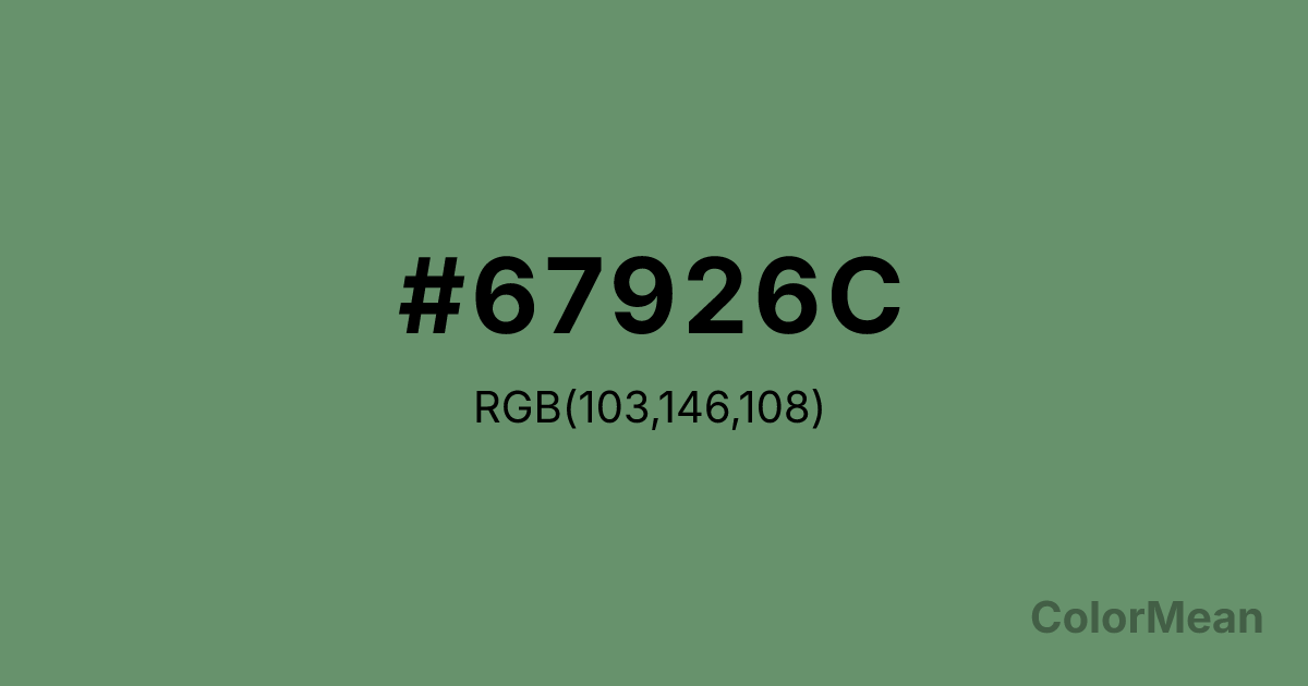 #67926C RGB value is (103, 146, 108). The hex color red value is 103, green is 146, and blue is 108. Its HSL format shows a hue of 127°, saturation of 17 percent, and lightness of 49 percent. The CMYK process values are 29 percent, 0 percent, 26 percent, 43 percent.