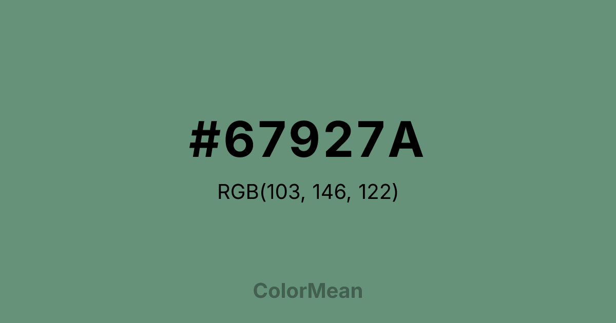 #67927A RGB value is (103, 146, 122). The hex color red value is 103, green is 146, and blue is 122. Its HSL format shows a hue of 147°, saturation of 17 percent, and lightness of 49 percent. The CMYK process values are 29 percent, 0 percent, 16 percent, 43 percent.