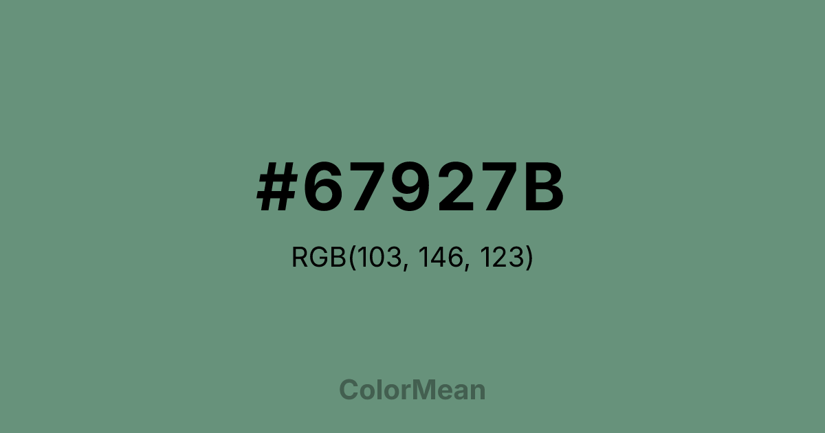 #67927B RGB value is (103, 146, 123). The hex color red value is 103, green is 146, and blue is 123. Its HSL format shows a hue of 148°, saturation of 17 percent, and lightness of 49 percent. The CMYK process values are 29 percent, 0 percent, 16 percent, 43 percent.