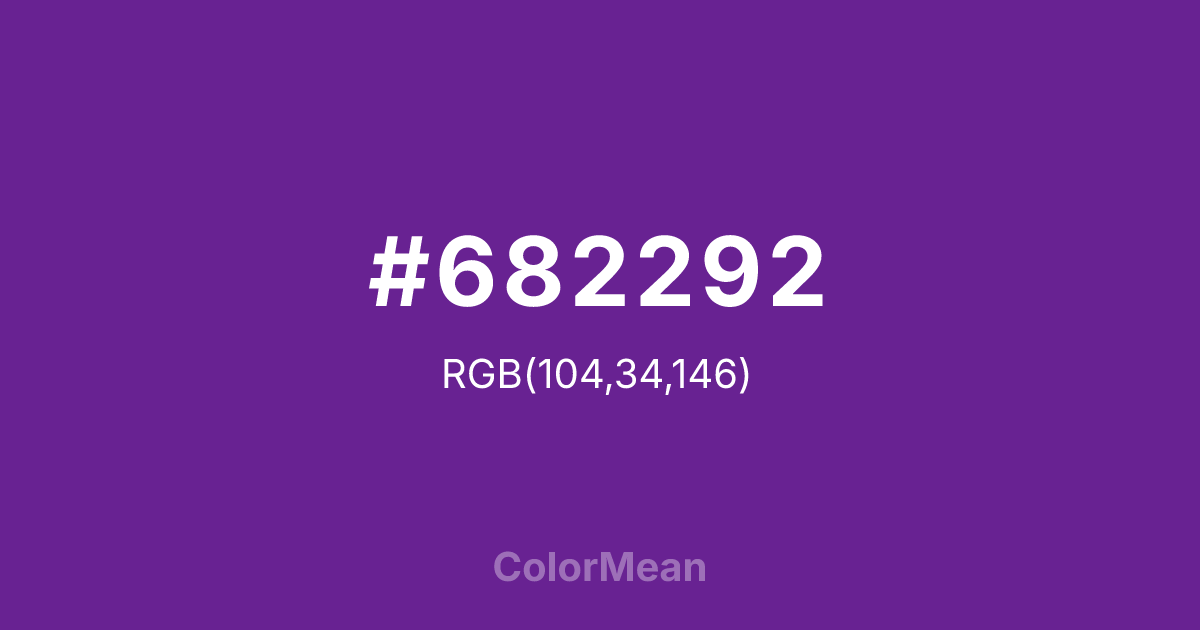 #682292 RGB value is (104, 34, 146). The hex color red value is 104, green is 34, and blue is 146. Its HSL format shows a hue of 278°, saturation of 62 percent, and lightness of 35 percent. The CMYK process values are 29 percent, 77 percent, 0 percent, 43 percent.