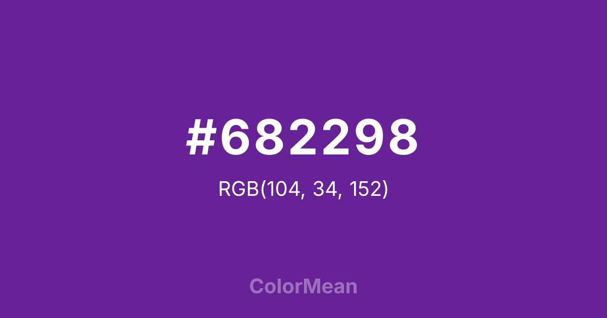#682298 RGB value is (104, 34, 152). The hex color red value is 104, green is 34, and blue is 152. Its HSL format shows a hue of 276°, saturation of 63 percent, and lightness of 36 percent. The CMYK process values are 32 percent, 78 percent, 0 percent, 40 percent.