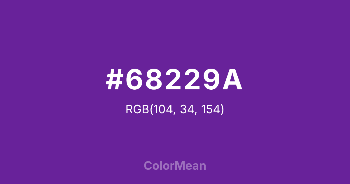 #68229A RGB value is (104, 34, 154). The hex color red value is 104, green is 34, and blue is 154. Its HSL format shows a hue of 275°, saturation of 64 percent, and lightness of 37 percent. The CMYK process values are 32 percent, 78 percent, 0 percent, 40 percent.