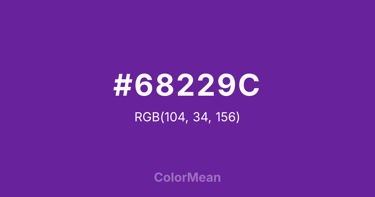 #68229C RGB value is (104, 34, 156). The hex color red value is 104, green is 34, and blue is 156. Its HSL format shows a hue of 274°, saturation of 64 percent, and lightness of 37 percent. The CMYK process values are 33 percent, 78 percent, 0 percent, 39 percent.