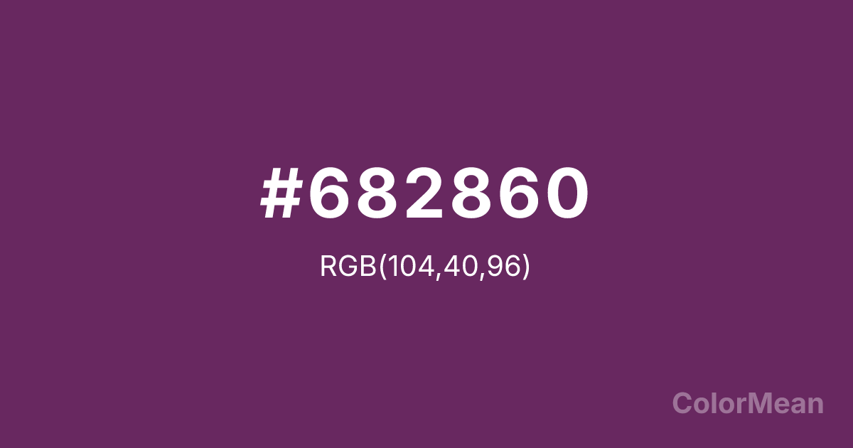 Palatinate Purple (#682860) RGB value is (104, 40, 96). The hex color red value is 104, green is 40, and blue is 96. Its HSL format shows a hue of 308°, saturation of 44 percent, and lightness of 28 percent. The CMYK process values are 0 percent, 62 percent, 8 percent, 59 percent.