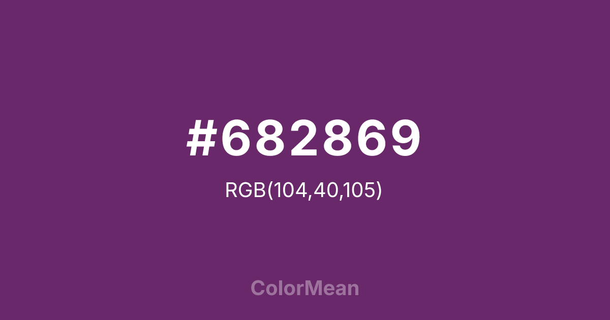 #682869 RGB value is (104, 40, 105). The hex color red value is 104, green is 40, and blue is 105. Its HSL format shows a hue of 299°, saturation of 45 percent, and lightness of 28 percent. The CMYK process values are 1 percent, 62 percent, 0 percent, 59 percent.