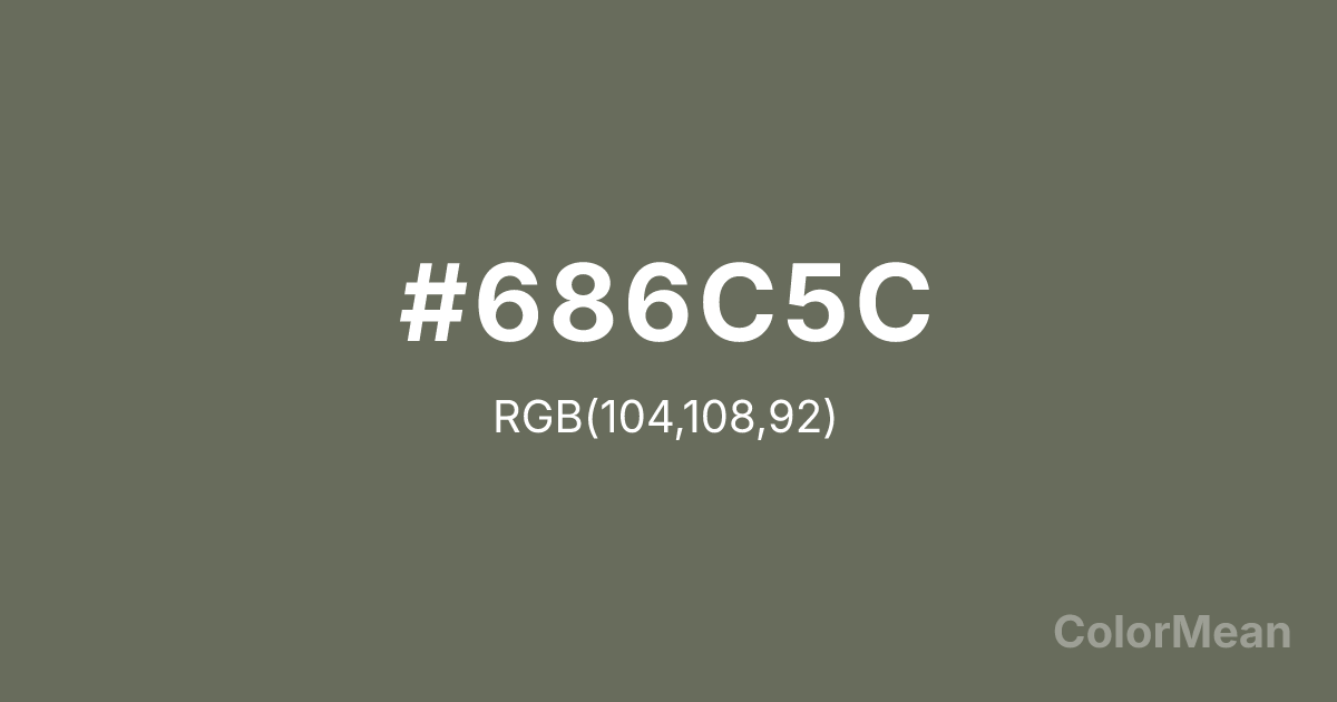#686C5C RGB value is (104, 108, 92). The hex color red value is 104, green is 108, and blue is 92. Its HSL format shows a hue of 75°, saturation of 8 percent, and lightness of 39 percent. The CMYK process values are 4 percent, 0 percent, 15 percent, 58 percent.