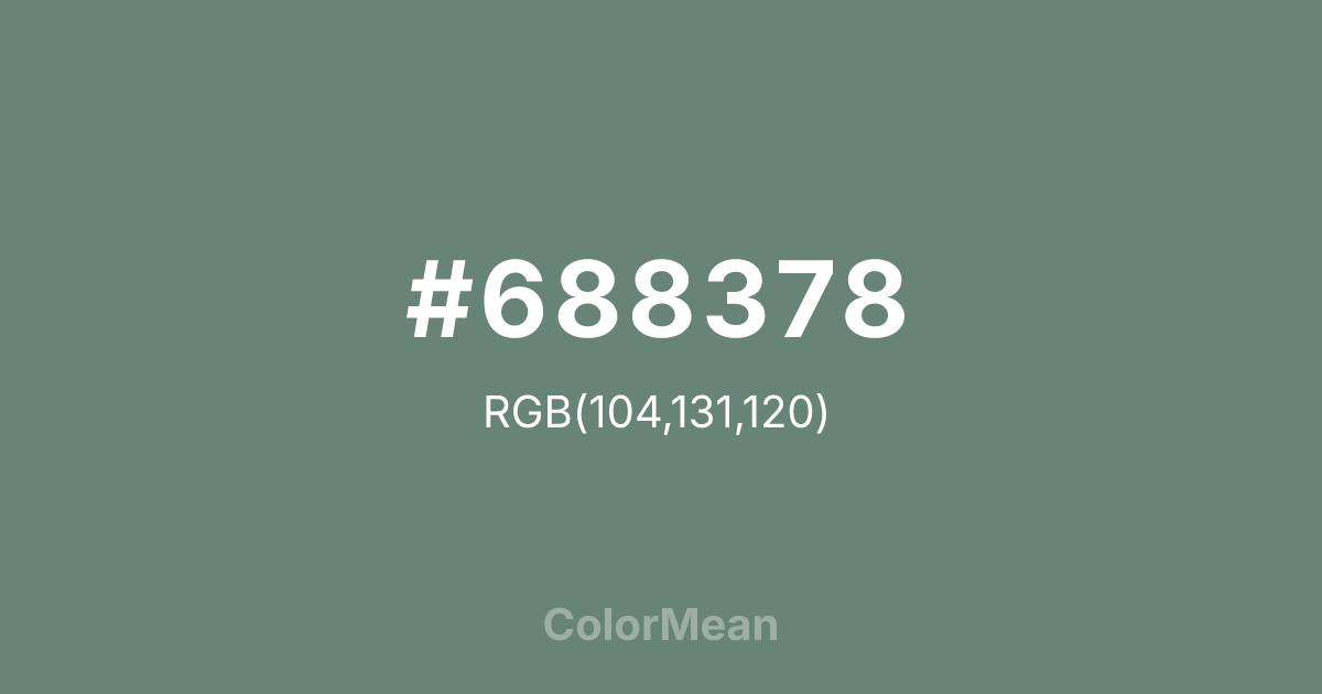 #688378 RGB value is (104, 131, 120). The hex color red value is 104, green is 131, and blue is 120. Its HSL format shows a hue of 156°, saturation of 11 percent, and lightness of 46 percent. The CMYK process values are 21 percent, 0 percent, 8 percent, 49 percent.