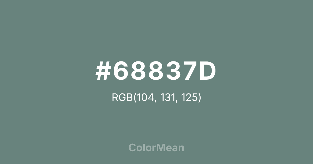 #68837D RGB value is (104, 131, 125). The hex color red value is 104, green is 131, and blue is 125. Its HSL format shows a hue of 167°, saturation of 11 percent, and lightness of 46 percent. The CMYK process values are 21 percent, 0 percent, 5 percent, 49 percent.