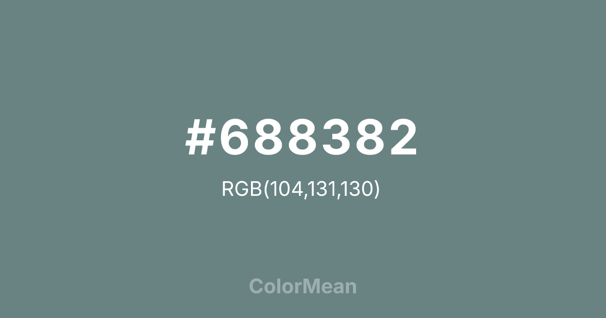 #688382 RGB value is (104, 131, 130). The hex color red value is 104, green is 131, and blue is 130. Its HSL format shows a hue of 178°, saturation of 11 percent, and lightness of 46 percent. The CMYK process values are 21 percent, 0 percent, 1 percent, 49 percent.