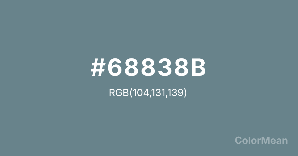 LightBlue4 (#68838B) RGB value is (104, 131, 139). The hex color red value is 104, green is 131, and blue is 139. Its HSL format shows a hue of 194°, saturation of 14 percent, and lightness of 48 percent. The CMYK process values are 25 percent, 6 percent, 0 percent, 45 percent.