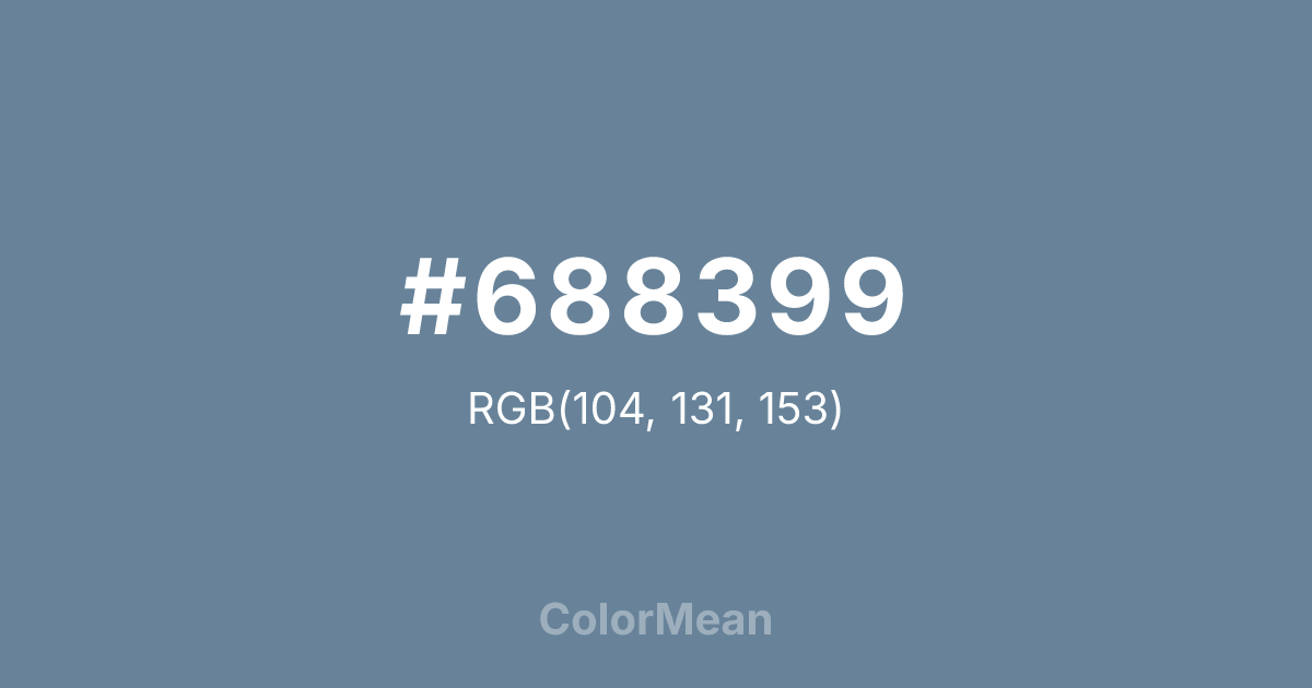 #688399 RGB value is (104, 131, 153). The hex color red value is 104, green is 131, and blue is 153. Its HSL format shows a hue of 207°, saturation of 19 percent, and lightness of 50 percent. The CMYK process values are 32 percent, 14 percent, 0 percent, 40 percent.