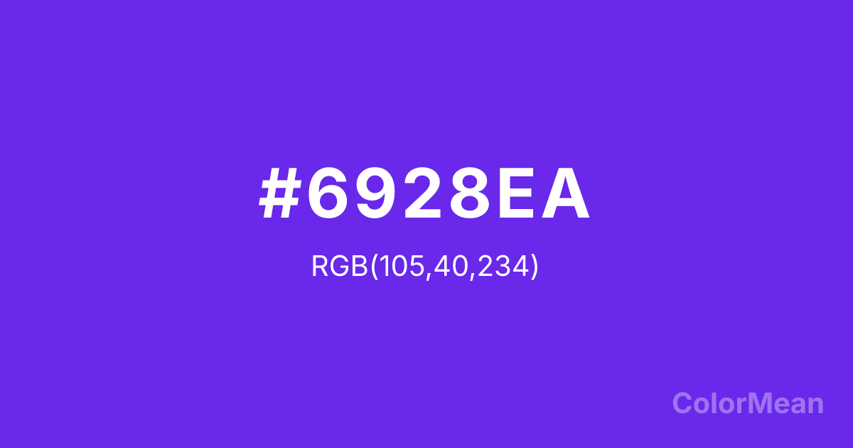 #6928EA RGB value is (105, 40, 234). The hex color red value is 105, green is 40, and blue is 234. Its HSL format shows a hue of 260°, saturation of 82 percent, and lightness of 54 percent. The CMYK process values are 55 percent, 83 percent, 0 percent, 8 percent.