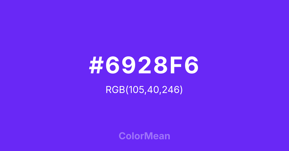 #6928F6 RGB value is (105, 40, 246). The hex color red value is 105, green is 40, and blue is 246. Its HSL format shows a hue of 259°, saturation of 92 percent, and lightness of 56 percent. The CMYK process values are 57 percent, 84 percent, 0 percent, 4 percent.
