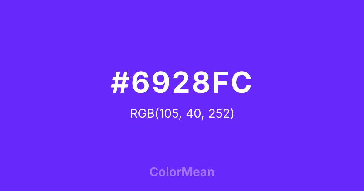 #6928FC RGB value is (105, 40, 252). The hex color red value is 105, green is 40, and blue is 252. Its HSL format shows a hue of 258°, saturation of 97 percent, and lightness of 57 percent. The CMYK process values are 58 percent, 84 percent, 0 percent, 1 percent.