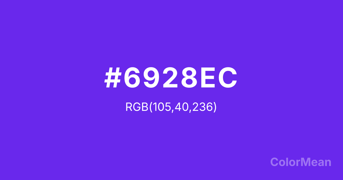 Electric Violet (#6928EC) RGB value is (105, 40, 236). The hex color red value is 105, green is 40, and blue is 236. Its HSL format shows a hue of 260°, saturation of 84 percent, and lightness of 54 percent. The CMYK process values are 56 percent, 83 percent, 0 percent, 7 percent.