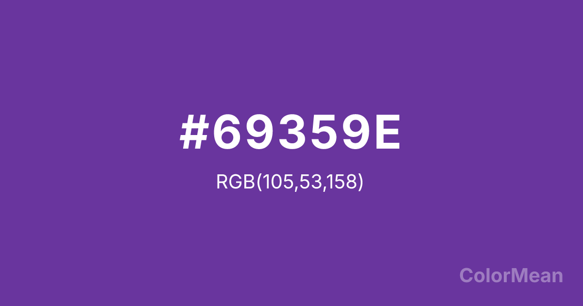 #69359E RGB value is (105, 53, 158). The hex color red value is 105, green is 53, and blue is 158. Its HSL format shows a hue of 270°, saturation of 50 percent, and lightness of 41 percent. The CMYK process values are 34 percent, 66 percent, 0 percent, 38 percent.