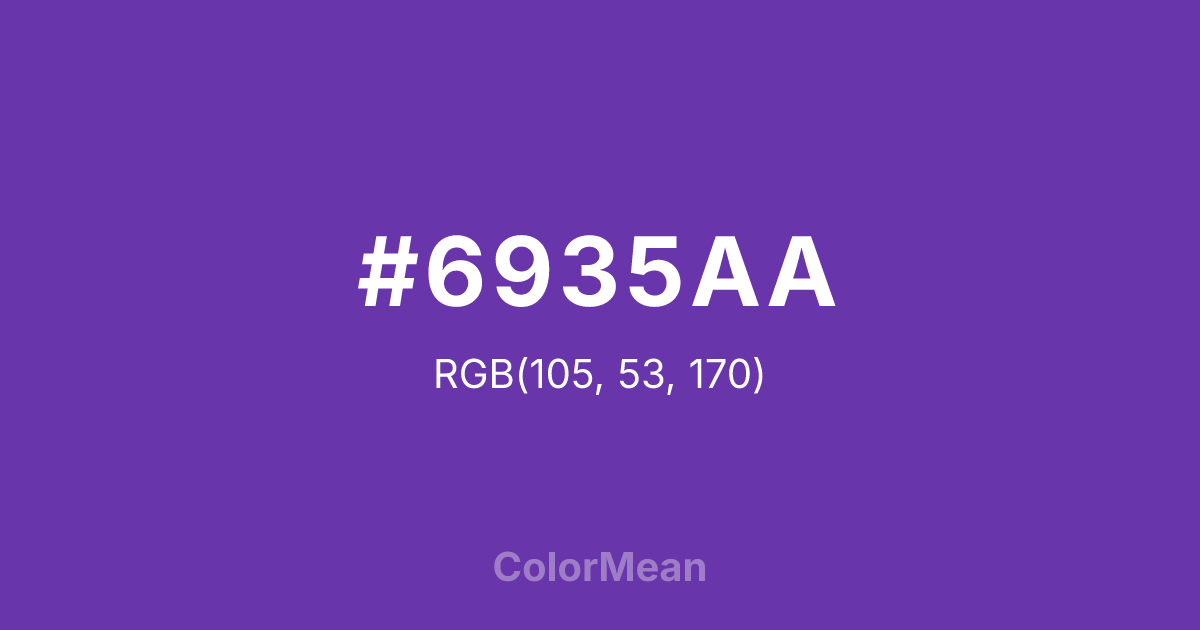 #6935AA RGB value is (105, 53, 170). The hex color red value is 105, green is 53, and blue is 170. Its HSL format shows a hue of 267°, saturation of 52 percent, and lightness of 44 percent. The CMYK process values are 38 percent, 69 percent, 0 percent, 33 percent.