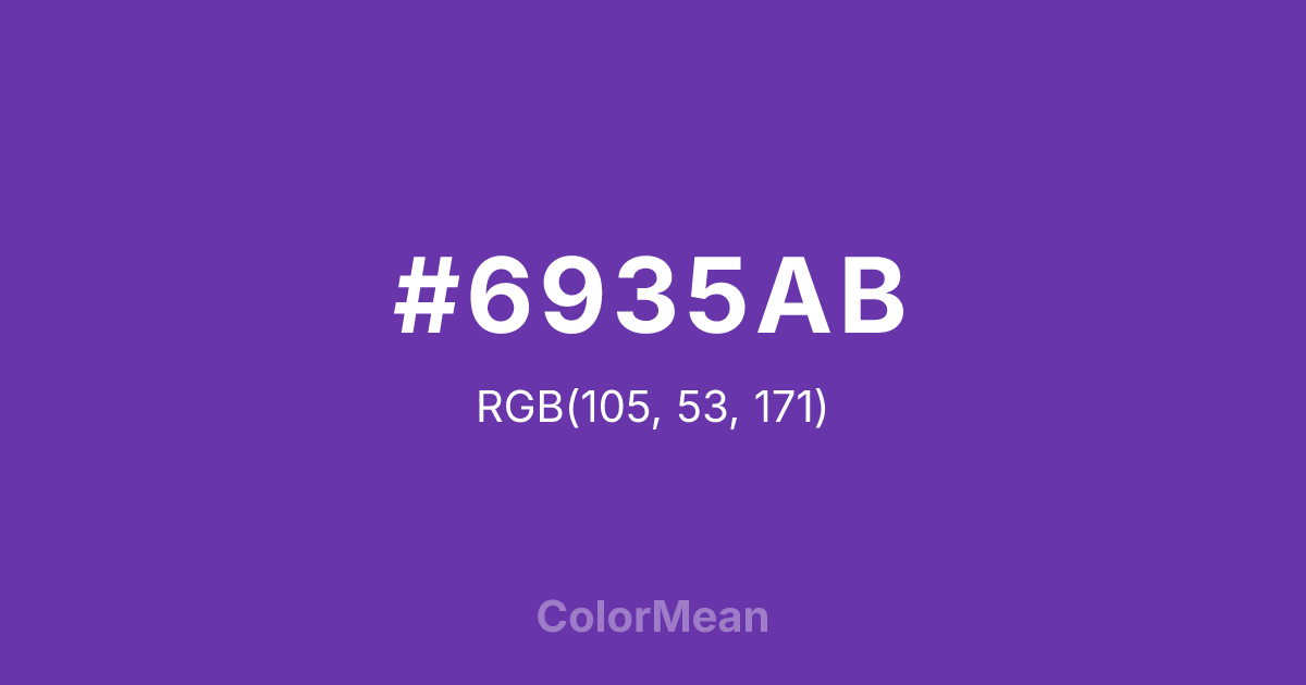 #6935AB RGB value is (105, 53, 171). The hex color red value is 105, green is 53, and blue is 171. Its HSL format shows a hue of 266°, saturation of 53 percent, and lightness of 44 percent. The CMYK process values are 39 percent, 69 percent, 0 percent, 33 percent.