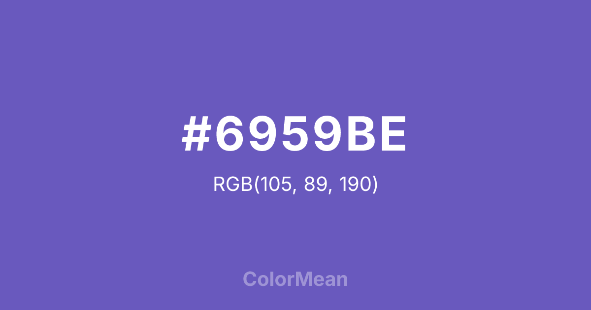 #6959BE RGB value is (105, 89, 190). The hex color red value is 105, green is 89, and blue is 190. Its HSL format shows a hue of 250°, saturation of 44 percent, and lightness of 55 percent. The CMYK process values are 45 percent, 53 percent, 0 percent, 25 percent.