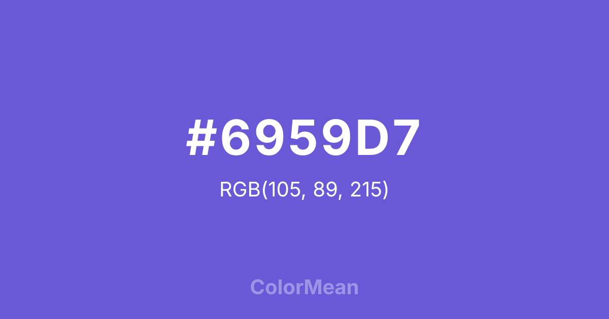 #6959D7 RGB value is (105, 89, 215). The hex color red value is 105, green is 89, and blue is 215. Its HSL format shows a hue of 248°, saturation of 61 percent, and lightness of 60 percent. The CMYK process values are 51 percent, 59 percent, 0 percent, 16 percent.