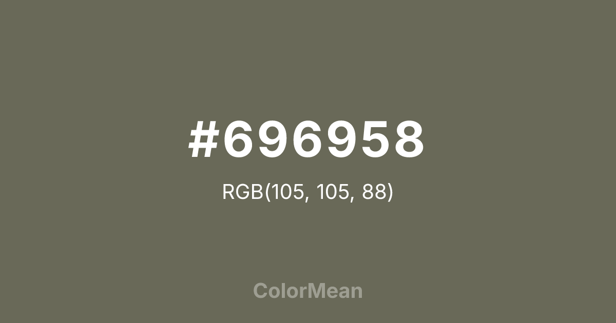 #696958 RGB value is (105, 105, 88). The hex color red value is 105, green is 105, and blue is 88. Its HSL format shows a hue of 60°, saturation of 9 percent, and lightness of 38 percent. The CMYK process values are 0 percent, 0 percent, 16 percent, 59 percent.
