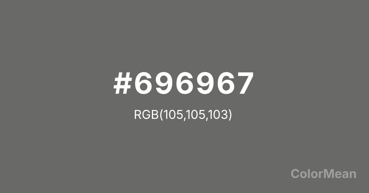 #696967 RGB value is (105, 105, 103). The hex color red value is 105, green is 105, and blue is 103. Its HSL format shows a hue of 60°, saturation of 1 percent, and lightness of 41 percent. The CMYK process values are 0 percent, 0 percent, 2 percent, 59 percent.
