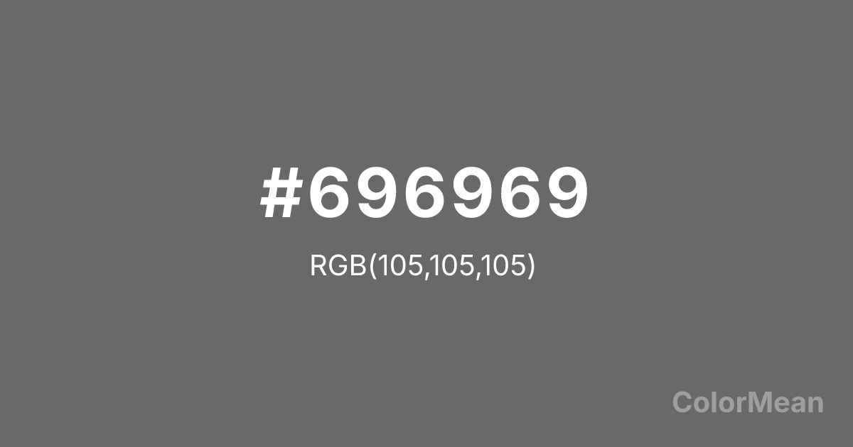 Dimgray (#696969) RGB value is (105, 105, 105). The hex color red value is 105, green is 105, and blue is 105. Its HSL format shows a hue of 0°, saturation of 0 percent, and lightness of 41 percent. The CMYK process values are 0 percent, 0 percent, 0 percent, 59 percent.