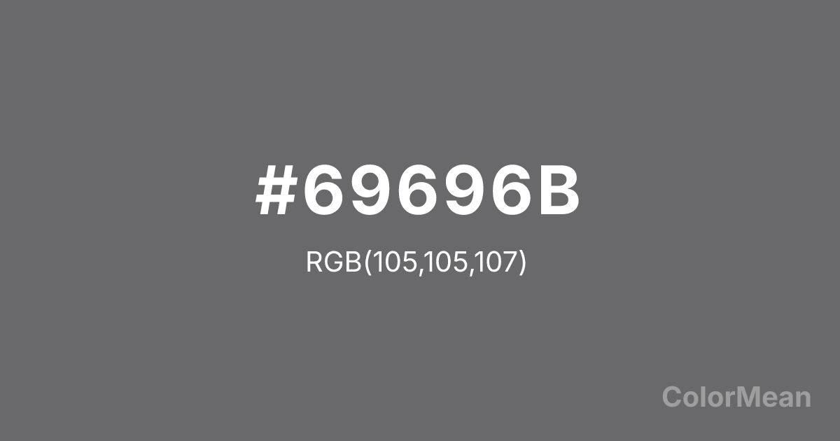 #69696B RGB value is (105, 105, 107). The hex color red value is 105, green is 105, and blue is 107. Its HSL format shows a hue of 240°, saturation of 1 percent, and lightness of 42 percent. The CMYK process values are 2 percent, 2 percent, 0 percent, 58 percent.