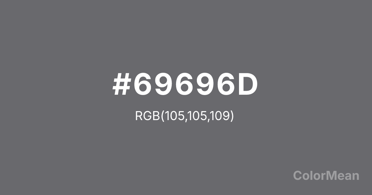 #69696D RGB value is (105, 105, 109). The hex color red value is 105, green is 105, and blue is 109. Its HSL format shows a hue of 240°, saturation of 2 percent, and lightness of 42 percent. The CMYK process values are 4 percent, 4 percent, 0 percent, 57 percent.