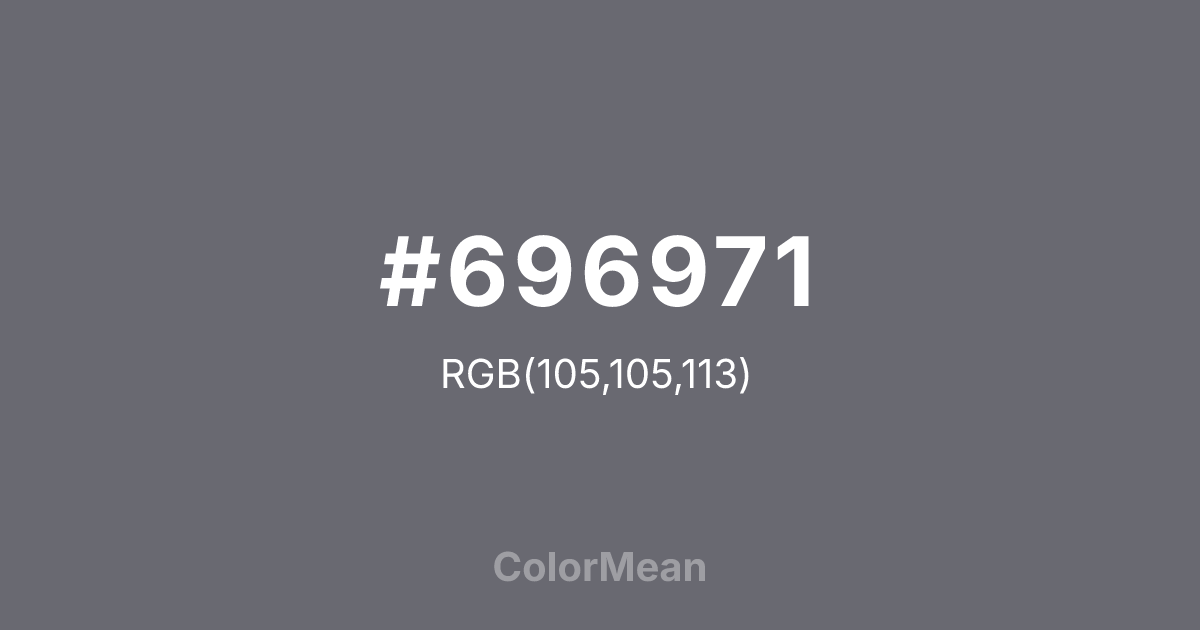 #696971 RGB value is (105, 105, 113). The hex color red value is 105, green is 105, and blue is 113. Its HSL format shows a hue of 240°, saturation of 4 percent, and lightness of 43 percent. The CMYK process values are 7 percent, 7 percent, 0 percent, 56 percent.