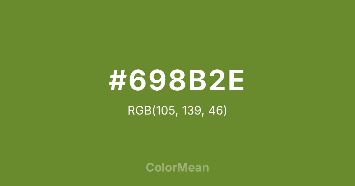 #698B2E RGB value is (105, 139, 46). The hex color red value is 105, green is 139, and blue is 46. Its HSL format shows a hue of 82°, saturation of 50 percent, and lightness of 36 percent. The CMYK process values are 24 percent, 0 percent, 67 percent, 45 percent.