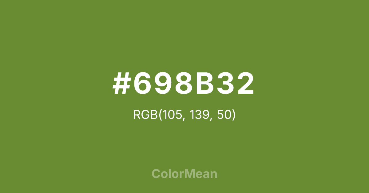 #698B32 RGB value is (105, 139, 50). The hex color red value is 105, green is 139, and blue is 50. Its HSL format shows a hue of 83°, saturation of 47 percent, and lightness of 37 percent. The CMYK process values are 24 percent, 0 percent, 64 percent, 45 percent.