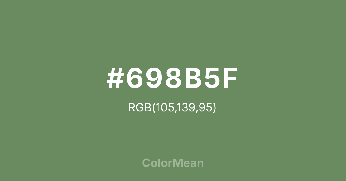 #698B5F RGB value is (105, 139, 95). The hex color red value is 105, green is 139, and blue is 95. Its HSL format shows a hue of 106°, saturation of 19 percent, and lightness of 46 percent. The CMYK process values are 24 percent, 0 percent, 32 percent, 45 percent.