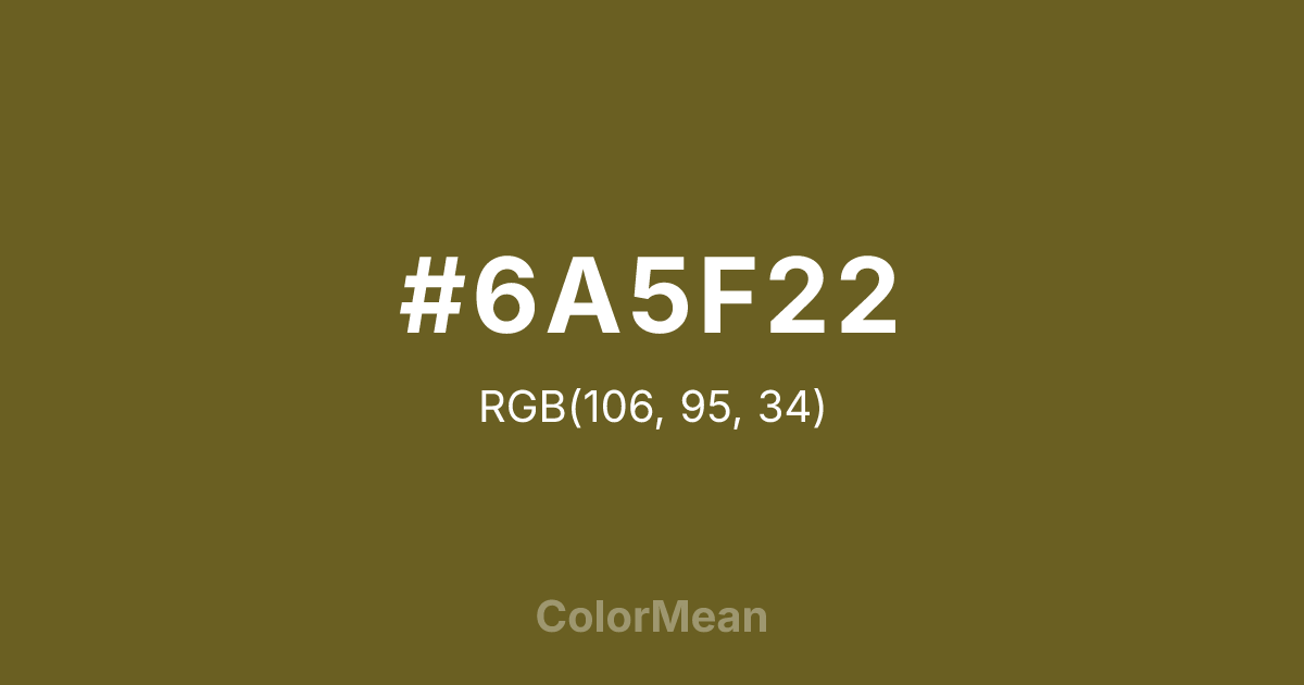 #6A5F22 RGB value is (106, 95, 34). The hex color red value is 106, green is 95, and blue is 34. Its HSL format shows a hue of 51°, saturation of 51 percent, and lightness of 27 percent. The CMYK process values are 0 percent, 10 percent, 68 percent, 58 percent.