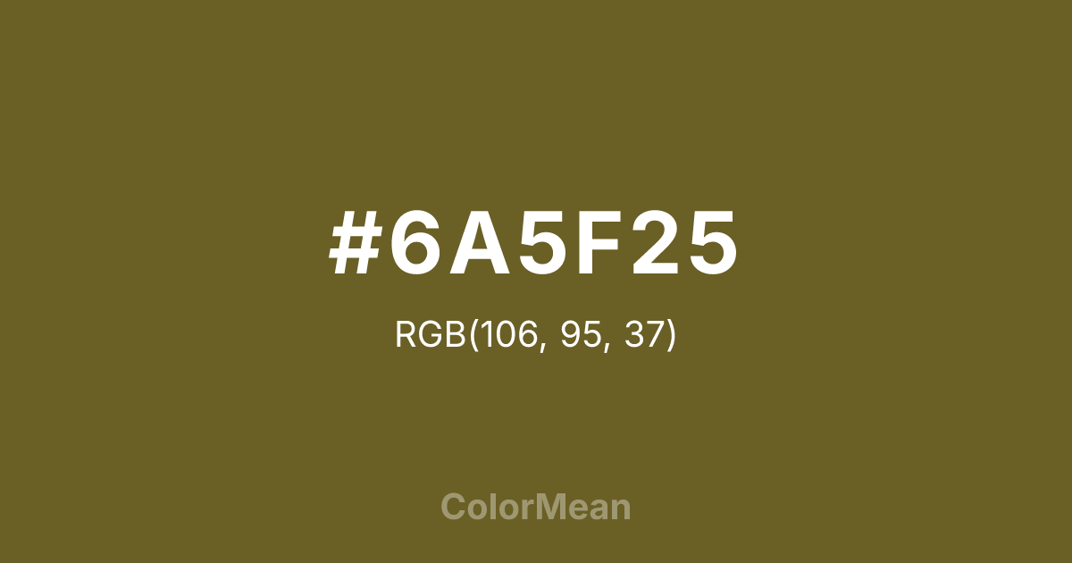 #6A5F25 RGB value is (106, 95, 37). The hex color red value is 106, green is 95, and blue is 37. Its HSL format shows a hue of 50°, saturation of 48 percent, and lightness of 28 percent. The CMYK process values are 0 percent, 10 percent, 65 percent, 58 percent.