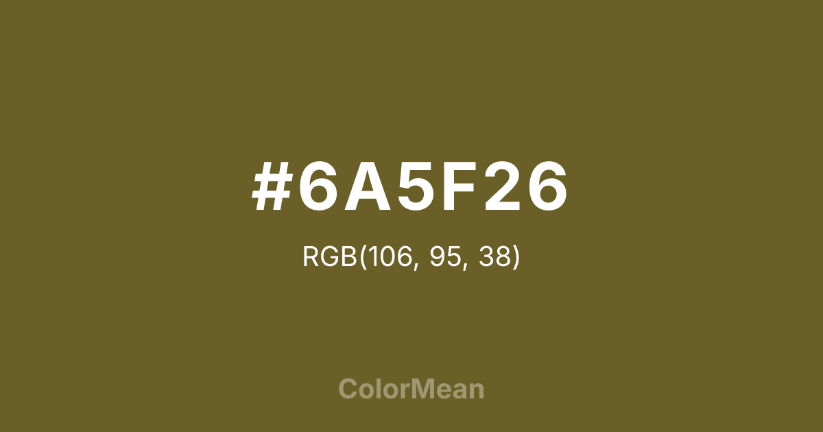 #6A5F26 RGB value is (106, 95, 38). The hex color red value is 106, green is 95, and blue is 38. Its HSL format shows a hue of 50°, saturation of 47 percent, and lightness of 28 percent. The CMYK process values are 0 percent, 10 percent, 64 percent, 58 percent.
