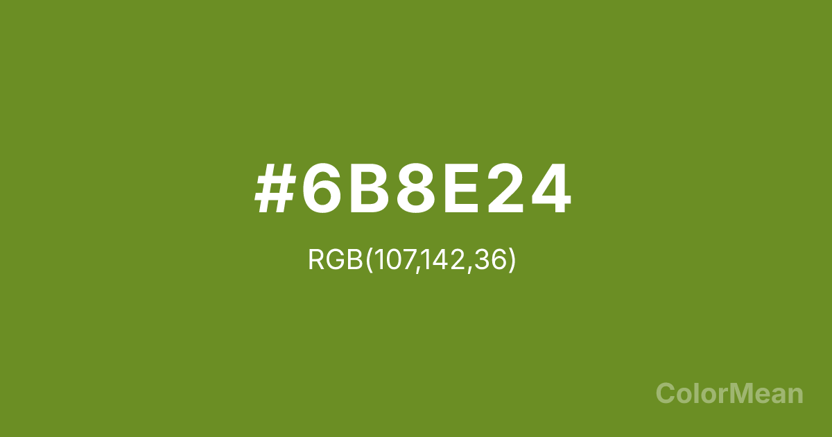 #6B8E24 RGB value is (107, 142, 36). The hex color red value is 107, green is 142, and blue is 36. Its HSL format shows a hue of 80°, saturation of 60 percent, and lightness of 35 percent. The CMYK process values are 25 percent, 0 percent, 75 percent, 44 percent.